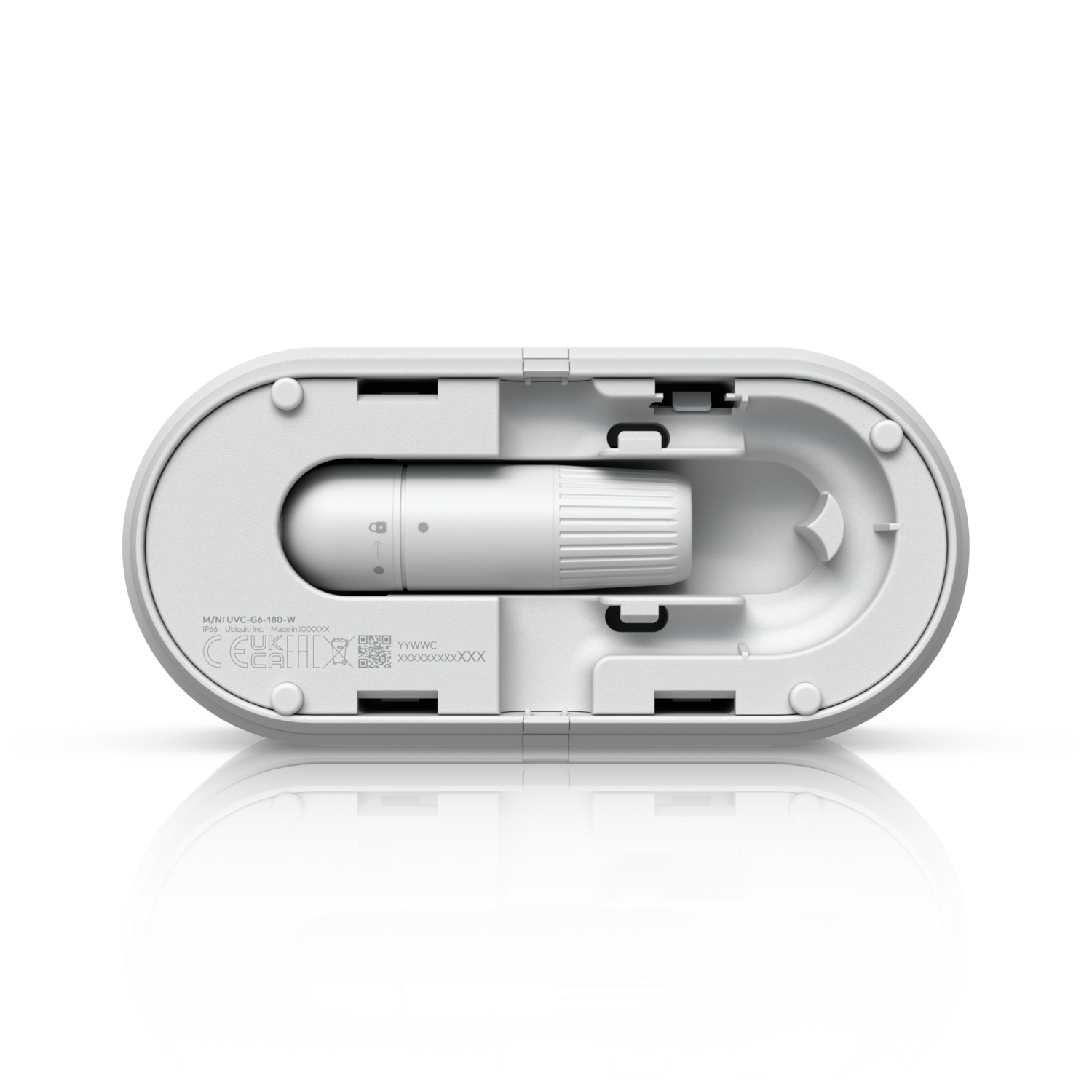 Ubiquiti G6 180 er bygget for både ute- og innebruk med værbestandig kapsling (IP66) som beskytter mot regn, støv og ekstreme forhold. Kameraet tåler temperaturområder fra -20 til 50 °C og har en solid konstruksjon i aluminium og polykarbonat som sikrer lang levetid.